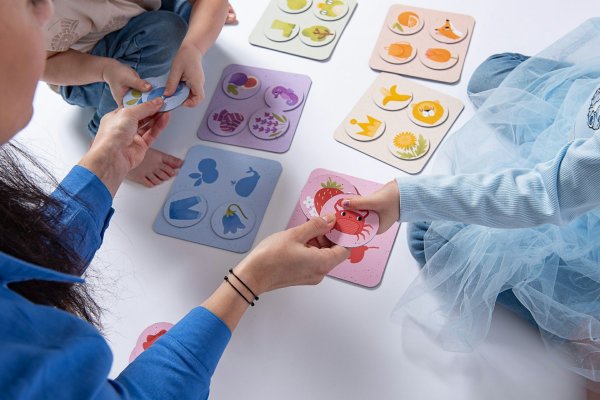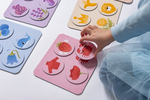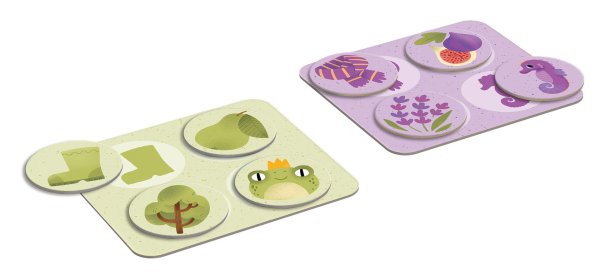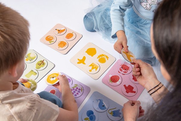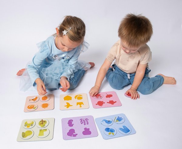 Položte vybranú dosku a zodpovedajúce žetóny pred dieťa. Dieťa má za úlohu umiestňovať žetóny na správne miesta podľa farieb a príslušných tieňov – obrysov. Pridajte na plochu viac žetónov. Požiadajte svoje dieťa, aby prikladalo žetóny na správne miesta na hracích doskách. Cieľom je vyskladať všetky žetóny na hracie dosky a docieliť, aby dieťa správne položilo všetky žetóny.