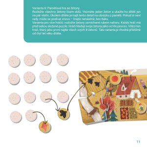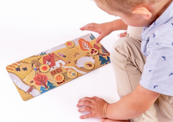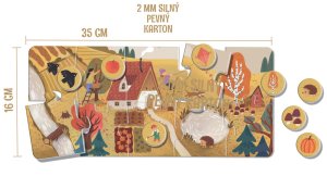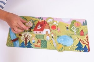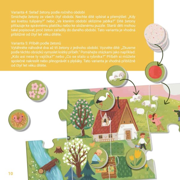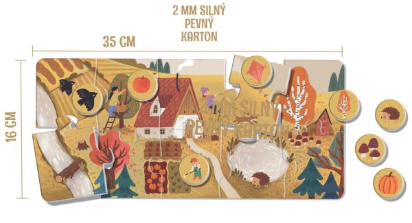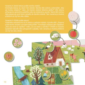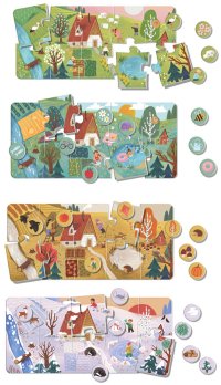Štyri ročné obdobia ako veľké obrázkové puzzle pre deti od 2 rokov. Každé obdobie tvorí veľké puzzle o 10 dielikoch (35 × 16 cm) a 8 tematických žetónov (O 3,5 cm) s detailmi – dieťa ich hľadá, priraďuje a triedi k jednotlivým puzzle.