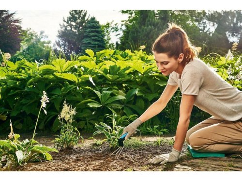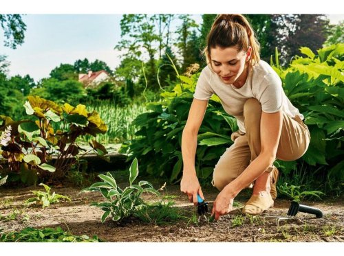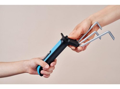 Ručný kultivátor s ergonomicky tvarovanou rukoväťou a opierkou pľaca pre ľahšiu prácu, pomáha na odstránenie buriny či na prípravu zeminy na siatie semien.