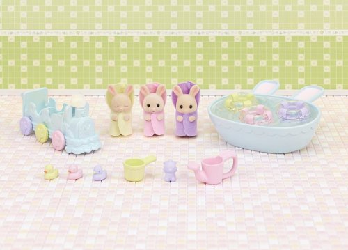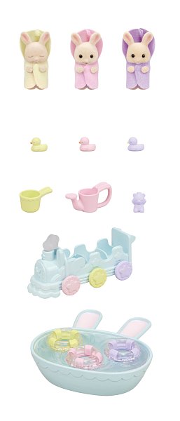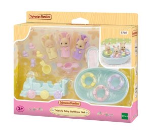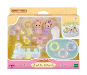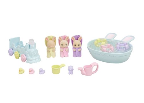 Trojčatá Owen, Isla a Iris sú najnovšie prírastky v rodine mliečnych králikov a prichádzajú v zábavnej kúpeľovej sade. Sada obsahuje tri malé figúrky pokryté mäkkým semišovým kožúškom a množstvo doplnkov. Trojčatá sú oblečené do zábavných, farebných županov a každé z trojčiatok má iný výraz tváre. Hračky Sylvanian Families rozvíjajú predstavivosť a podporujú deti na hranie rolí. Hranie s figúrkami Sylvanian Families rozvíja kreativitu a učí emócie prostredníctvom vytvárania a rozprávania príbehov na základe každodenných skúseností a pozorovaní sveta. Vyznačujú sa najvyššou kvalitou a výnimočným dôrazom na detaily. Oblečenie je vyrobené tak, aby sa dalo opakovane vyzliekať a obliekať. Obsah: 3 figúrky, vanička, 3 gumové kačičky, vozítko v tvare vláčika, šampón, kýblik a kanvička. Balené v krabičke. Rozmery balenia: 15 x 20 x 5,5 cm. Vek: 3+