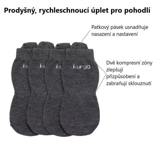 Ponožky Kurgo® Blaze sú navrhnuté tak, aby zlepšili padnutie a komfort topánok Kurgo® Blaze a udržali nohy Vášho psa na cestách v suchu. Dve kompresné zóny zaisťujú bezpečné uchytenie a zabraňujú skĺznutiu ponožky, keď je psík zaneprázdnený objavovaním okolia. Priedušná tkanina odvádzajúca vlhkosť zaisťuje rýchle schnutie nielen pre šteňatá, ktoré milujú kaluže. Ponožky pre psov sú dobrým nápadom aj z iného dôvodu: uľahčujú obúvanie a vyzúvanie topánok tým, že chráni jeho záprstie - ten smiešny malý prst navyše na vnútornej strane nohy. Praktické pútko je bonusom, ktorý Vám pomôže pri nasadzovaní ponožiek na labky Vášho psieho parťáka a ich úprave.
