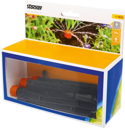 Tento nastaviteľný trysky pre je vhodný pre rastliny, ktoré vyžadujú väčší prísun vody. Vďaka 8mi otvorom v hlavici sa môže uvoľňovať od 0 do 40 litrov za hodinu. Prietok upravíte jednoucho Otočnım berevné hlavy. Inštalujeme zabodnutím ostrého konca kolíka do pôdy.