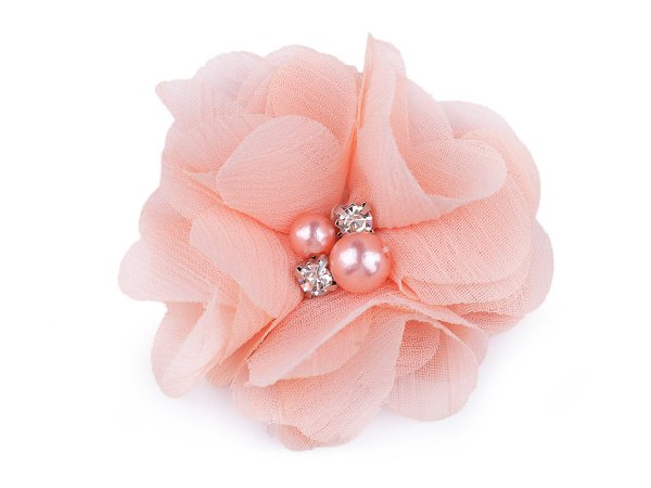 Textilný kvet pôsobí jemne a romanticky. V jeho strede sú našité plastové korálky a brúsené kamienky, ktoré sa efektne trblietajú. Neodporúčame prať, aby zostala zachovaná pôvodná kvalita výrobku. Použitie: Kvet môžete našiť ako ozdobu na spoločenské šaty, blúzky, tričká alebo svetre. Je vhodný aj na zdobenie klobúkov, čiapok a čeleniek do vlasov. Môžete ho tiež pomocou lepidla prilepiť na brošňový mostík a vytvoriť zaujímavý šperk. [U bielej farby sa môže líšiť farba kovu (platina, strieborná).]