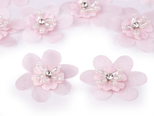 Elegantný kvet so zdobeným stredom je zložený z 2 vrstiev. Spodná časť kvetu je tuhá organza, horná časť je zosilnená a tvarovaná. Stred je ručne dozdobený brúseným kamienkom v kotlíku a korálkami, pôsobí veľmi romanticky. Brúsený kamienok v strede kvetu dodáva trblietavý efekt, zatiaľ čo korálky rozprestreté po okvetí zaisťujú bohatý a výrazný vzhľad. Použitie: Kvet môžete našiť či nalepiť na svetríky, blúzky, šaty, kabátiky, listové kabelky, tašky alebo vlasové ozdoby, klobúky a čiapky.
