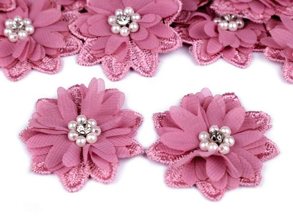 Nežný textilný kvet je zhotovený z krajkového základu a ďalších vrstiev, ktoré sú šifónové. Jeho stred zdobia korálky a trblietavý kamienok. Kvety môžete našiť či nalepiť na svetríky, blúzky, šaty, kabátiky, listové kabelky, tašky alebo klobúky a čiapky. Je vhodný aj na tvorbu brošní a rôznych vlasových ozdôb.