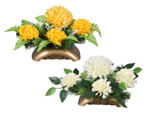 Väzba z umelých kvetov. Aranžmán z umelých kvetov imitujúcich chryzantémy je umiestnený v zlatej nádobe, doplnenej ihličinou, papradí či zelenými lístkami. Vhodná sezóna: jeseň. Rozmery: šírka 36 cm, výška 23 cm. Farba: mix farieb.