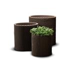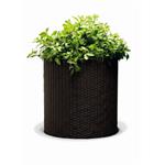 Okrúhly plastový obal na črepník s robustnou konštrukciou a imitáciou rattanového výpletu. Jeho súčasťou je drenážny systém na reguláciu zavlažovania rastlín. Obal je vysoko odolný voči vplyvom počasia. Farba: hnedá. Priemer: 36 cm, výška: 37 cm.