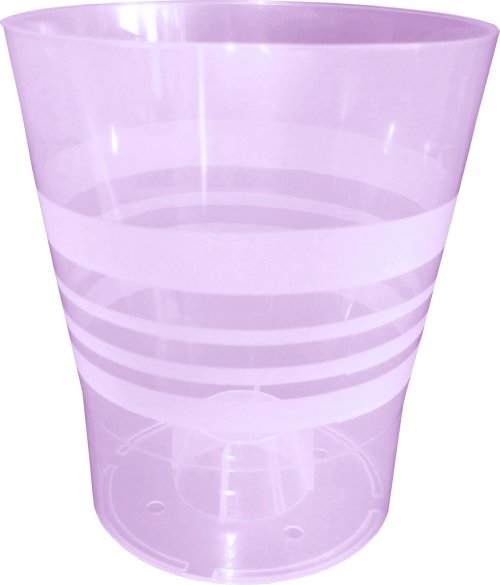 Plastový kvetináč pre orchidey. Zvýšené dno zabezpečuje, aby rastlina netrpela preliatím a prebytkom vody, čo je najčastejšou príčinou ich zvädnutí. Možno použiť aj ako obal, odtokové otvory sú len naznačené.