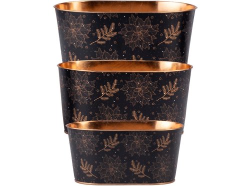 Súprava troch oválnych plechových kvetináčov s motívom vianočnej hviezdy s vetvičkou je elegantným doplnkom interiéru. Kombinácia čiernej a zlatej farby dodáva kvetináčom slávnostný a dekoratívny vzhľad. Ideálne pre vianočné aranžmány alebo ako štýlový darček.