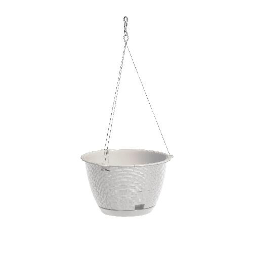 Plastový závesný črepník s pripevnenou podmiskou a plastovým hákom na zavesenie. Farba: biela. Priemer: 22 cm, výška: 14 cm.
