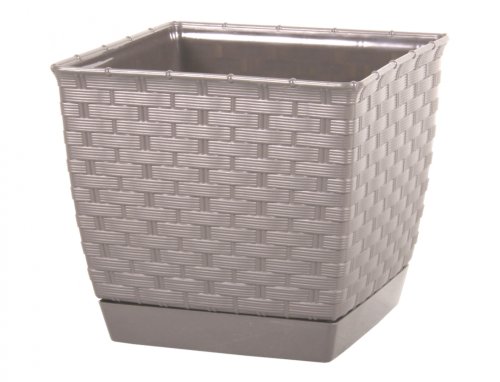 Hranatý plastový obal na črepník verne imituje ratanový výplet. Elegantný motív je vhodný do interiéru, na terasy aj balkóny. Farba: hnedo šedá. Šírka: 19 cm, výška: 16 cm, hĺbka: 19 cm.