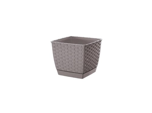 Hranatý plastový obal na črepník verne imituje ratanový výplet. Elegantný motív je vhodný do interiéru, na terasy aj balkóny. Farba: hnedo šedá. Šírka: 25 cm, výška: 22 cm, hĺbka: 25 cm.