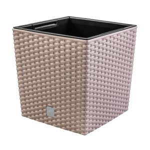 Hranatý plastový obal na črepník s textúrou imitujúcou ratanový výplet. Tento obal je skvelým doplnkom štýlových interiérov. Je vhodný do interiéru aj exteriéru, je odolný voči UV žiareniu. Súčasťou je čierna vnútorná vložka. Farba: hnedo šedá. Rozmery: 32 x 32 cm, výška: 33 cm.