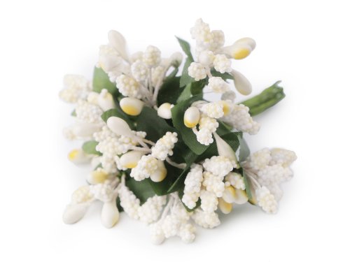 Bobuľky držia na kovovom drôtiku, ktorý je obalený floristickou páskou. Na jednom drôtiku je malý trs zložený z pestíkov, bobuliek a kališného lístka. Použitie: Bobuľky vyniknú v umelých kvetoch, vencoch aj dekoračných väzbách. Môžete ich tiež použiť ako pestíky pri výrobe kvetov z foamiranu. Jedinečne doplnia kvetinové venčeky do vlasov, fascinátorov a čelenky. Jeden zväzok obsahuje 12 kusov.