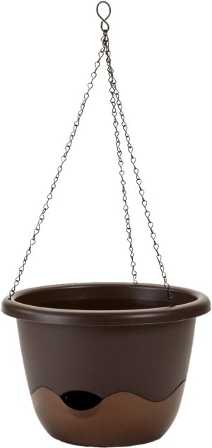 Plastový samozavlažovací črepník v modernom dvojfarebnom prevedení. Súčasťou je kovová retiazka pre ľahké zavesenie, knôt, zalievací/prepadový otvor a hladinomer. Šírka: 30 cm, výška: 20 cm.