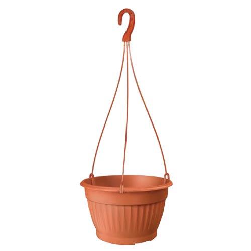 Plastový v pôdoryse okrúhly jemne kónický závesný, samozavlažovací kvetináč vo farbe terakoty v časti s vylisovanými pruhmi, vedenými vertikálne. Horný okraj má širší, ohnutý smerom von. Používa sa na zavesenie s vysadenými previsnutými rastlinami v interiéri aj v exteriéri. Rozmery: d. 23,5 x v. 14,5 cm.