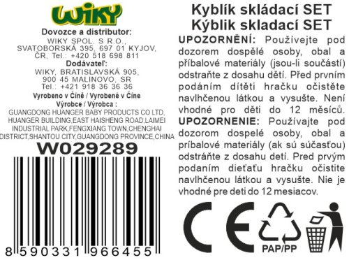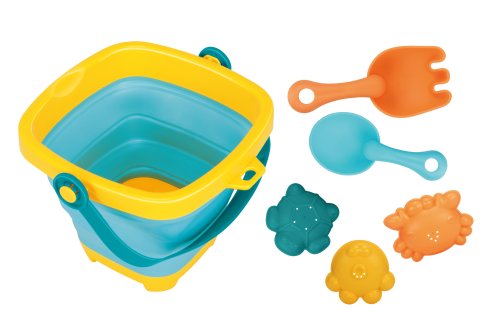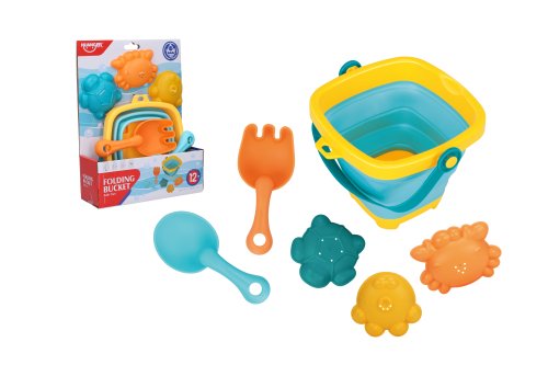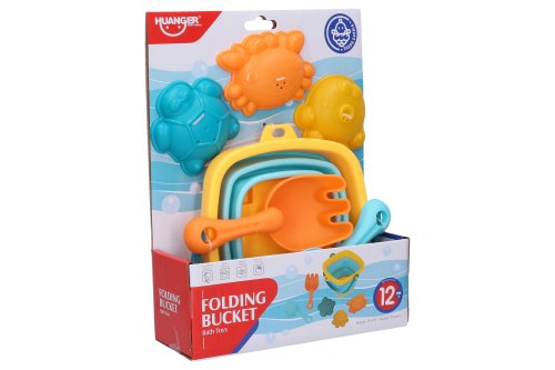 Kýblik skladací do vane alebo na piesok. Obsah balenia - skladací kýblik 19x18 cm, 3 formičky - korytnačka, krab, žaba, hrabličky a lopatka.