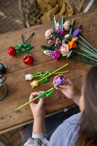 Štylizujte kvety ako profík Všetky detaily kytice sú vyrobené z LEGO súčiastok a je možné ich prispôsobiť tak, aby zanechali jedinečný dojem. Väčšina kvetov má okvetné lístky, ktoré je možné preusporiadať, takže si môžete užiť zábavu pri vymýšľaní rôznych designov. Rozoberte stonky a znovu ich zložte iným spôsobom, čím zmeníte výšku a tvar vašich kvetov. Sada je súčasťou botanickej LEGO kolekcie pre dospelých a obsahuje niekoľko dielikov z rastlinného plastu, ktorý sa trvalo udržateľným spôsobom vyrába z cukrovej trstiny.