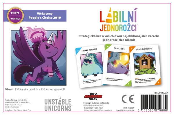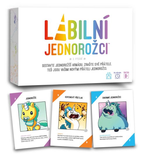 Labilný Jednorožci je strategická kartová hra o dvoch obľúbených veciach: jednorožcoch a ničenia! Začínate s malým jednorožčaťom vo vašej Stajni. Veľa „kjôůt“! Hlavne sa do nich príliš nezamilujte, pretože ani jednorožčie bábätká nie sú v tejto hre v bezpečí! Do svojej armády môžete pozbierať viac ako 20 druhov magických jednorožcov s vlastnou extra silou! Postavte svoju armádu tak rýchlo, ako to len pôjde, inak budete zničení nejakým z vašich rádoby priateľov. Či už máte v pláne sa pomstiť alebo brániť svoju Stajňu, použite Mágiu! Nič sa ale neponáhľajte, pretože niekto by mohol mať kartu "Íhaha"! Ten, kto ako prvý dokončí svoju armádu jednorožcov, bude nadosmrť ospevovaný… minimálne do budúcej hry. Veľa šťastia! Obsah balenia: 135 kariet1 české pravidlá