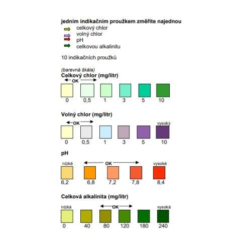 Návod na použitie: Ponorte prúžok do vody a ihneď ho vyberte. Držte prúžok 15 sec (nesotrepávajte zvyšky vody z prúžku) a potom porovnajte farbu políčka pre celkový chlór, voľný chlór, pH a celkovú alkalinitu s farebnou škálou na etikete obalu.