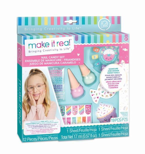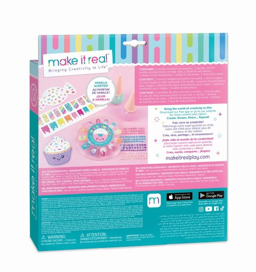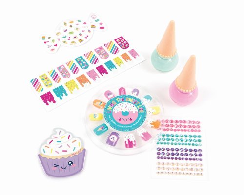 Set obsahuje 2 laky na nechty v tvare zmrzliny, samolepky a rôzne zdobenie na nechty, umelé nechty. Vhodné od 8 rokov. Laky na nechty sú na vodnej báze a dajú sa odstrániť jemným trením teplou vodou a mydlom.