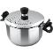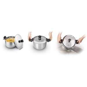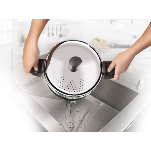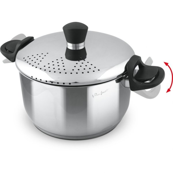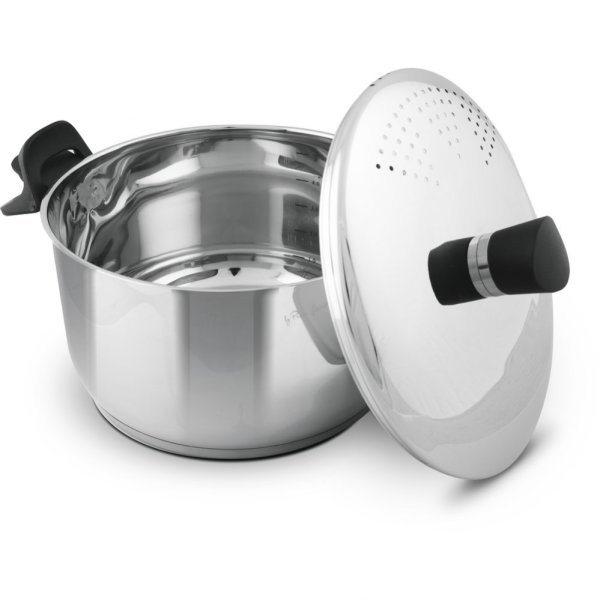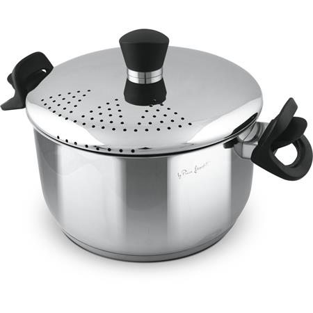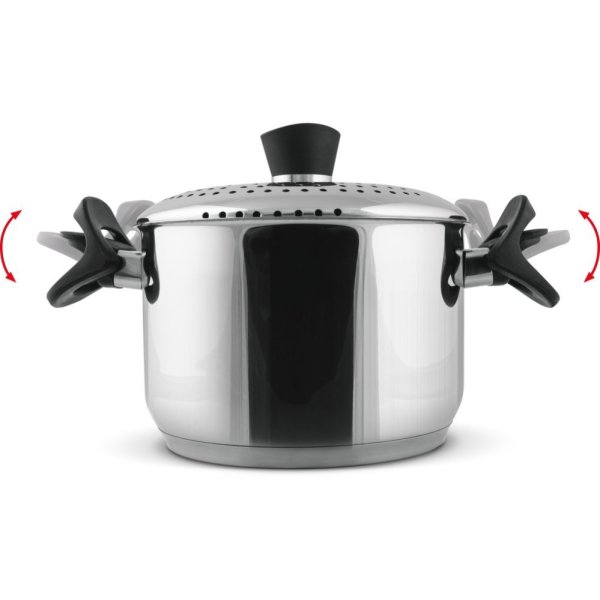 Pokrievka s cediacim mechanizmom z nehrdzavejúcej ocele so špeciálnym zachytením pomocou výklopných rukovätí pre komfortné cedenie cestovín.