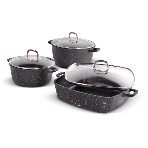 Rozmery: Kastról s pokrievkou Ø 20cm x 9 cm, objem 2,2 l Kastról s pokrievkou Ø 24cm x 11 cm, objem 4,2 l Pekáč s pokrievkou 28 x 28 x 7,5 cm, objem 4,8 l