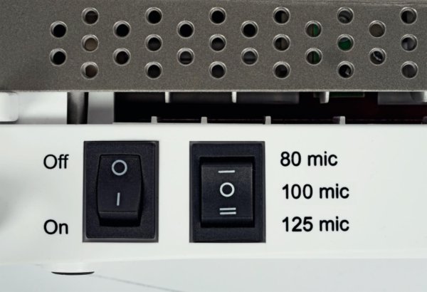 • Kolískový prepínač umožňuje výber z troch úrovní hrúbky vrecka pre všestranné použitie a splnenie všetkých požiadaviek na lamináciu