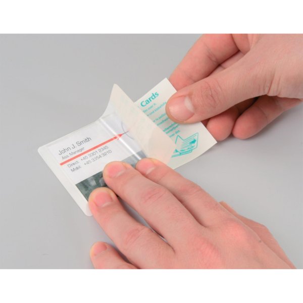 Určené na ručné laminovanie Materiál transparentný polyester Uzavreté na krátkej strane Jednu časť tvorí samolepiaca fólia Hrúbka fólie 2 x 100 mic Balenie po 10 kusoch Formát: 54 x 86 mm