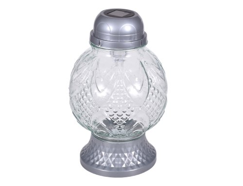 Sklenená cintorínska lampa v tvare gule, s bohatým reliéfnym zdobením. Sklo je číre, doplnené o plastový podstavec a viečko. Vo viečku je zabudovaný solárny panel so súmrakovým senzorom, ktorý zaistí automatické rozsvietenie po zotmení. Vďaka solárnemu napájaniu odpadá nutnosť výmeny náplní, čo zaisťuje pohodlné a dlhodobé použitie pri dekorácii pietnych miest. Rozmery: priemer 19 cm, výška 27 cm. Farba: strieborná.
