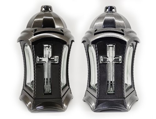 Cintorínska lampa v podobe lucerny kombinuje materiály sklo a plast. Je robustná a dozdobená bielym krížom. V lampičke je vymeniteľná náplň. Hmotnosť náplne: 110 g. Doba horenia: 40 hodín. Rozmery: priemer 17 cm, výška 27 cm. Farba: mix farieb.
