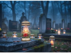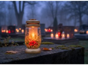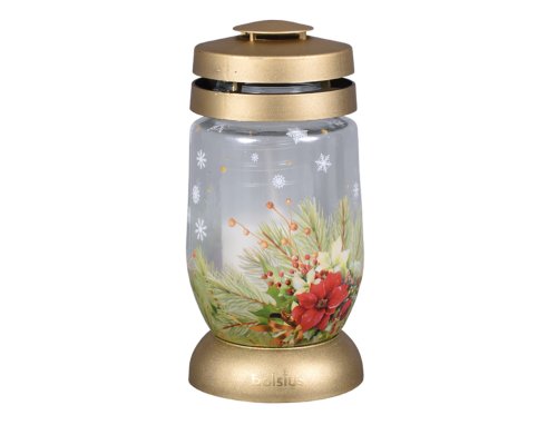 Cintorínska lampa s vianočne ladeným motívom ihličiny, vianočné hviezdy a snehových vločiek. S viečkom a podstavcom v zlatej farbe. Tematická kresba a moderné prevedenie lampy vytvára harmonický celok, ktorý vkusne ozdobí pietne miesta. Materiál: sklo, plast. Odolné proti vode a UV žiareniu. Hmotnosť náplne: 110 g. Doba horenia: 36 hodín. Rozmer: priemer 11 cm, výška: 22 cm. Farba: zlatá. Vhodná náhradná náplň: 92068bí (40 h), 92071bí (50 h), 92074bí (75 h), 92075bí (100h).