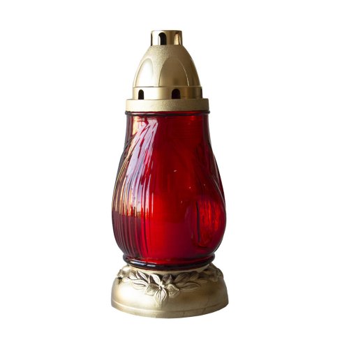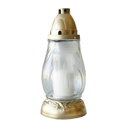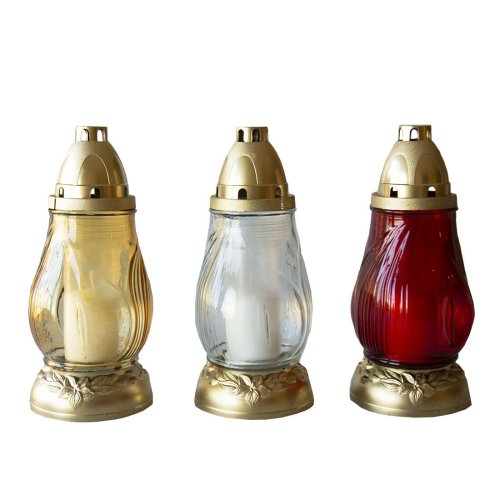 Sklenená cintorínska lampa na sviečky 24 cm s kužeľovitým vekom proti dažďu a proti uhaseniu plamienka vetrom.