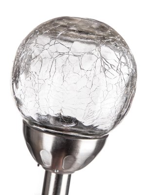 Lampa solárna GUĽA 10 cm, v. 38,5 cm, 2LED, číra, popraskaná. rozmery (pr. x V): 10 x 38,5 cm Solárna nerezová lampa o výške 38,5 cm, so skleneným dekoračným tienidlom v tvare gule s pavučinovým dekorom …