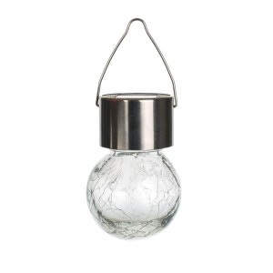 Závesná solárna nerezová lampa so skleneným dekoračným tienidlom v tvare gule s pavučinovým dekórom. Solárna lampa je funkčná a zároveň dekoračná súčasť do každej záhradky. Súčasťou lampy je aj závesný úchyt.