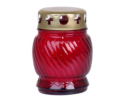 Cintorínska lampa so zdobením, súdkovitého tvaru. Je vyrobená zo skla, podstavec a viečko sú kovové. Vosk je naliaty priamo v lampe. Hmotnosť náplne: 25 g. Doba horenia: 7 hodín. Rozmery: výška 10 cm. Farba: červená, zlatá.