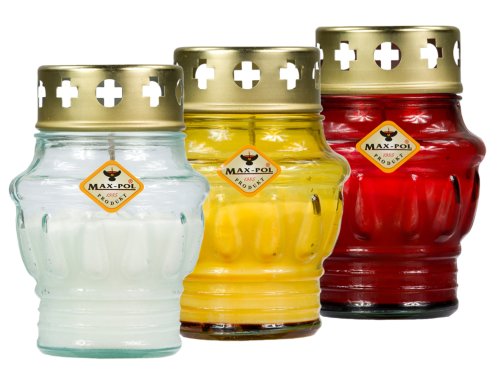 Sklenená cintorínska lampa s náplňou z liateho vosku. Má súdkovitý tvar a pozdĺžne prúžky v spodnej časti. Doplnená kovovým viečkom. Na vonkajšie použitie. Hmotnosť náplne: 60 g. Rozmery: priemer 8 cm, výška 10 cm. Farba: mix farieb biela, červená, žltá.