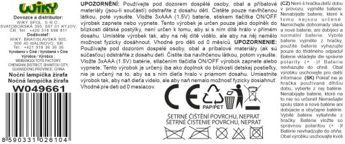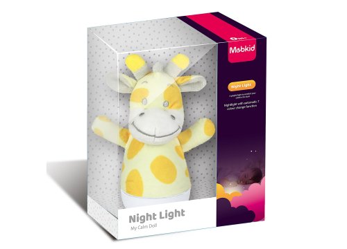 Lampička nočná žirafa zaspávač plyšový. Rozmery 11x8x15,5 cm. Aktivácia prepínačom na spodnej strane lampičky. Automaticky sa meniace farebné svetielko (7 farieb). 3xAAA (1.5V) batérie, nie sú súčasťou.