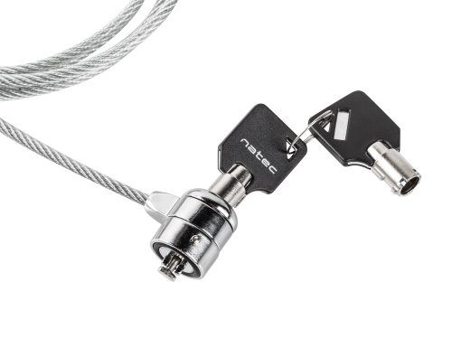 Lankový bezpečnostný zámok na kľúč pre notebooky vyrobený z galvanizovanej ocele, pokrytý gumovou vrstvou, vhodný na montáž v bezpečnostných slotoch notebookov a iných zariadení napr. trezoroch, ktorý zvyšuje bezpečnosť vášho zariadenia a poskytuje ochranu pred odcudzením.