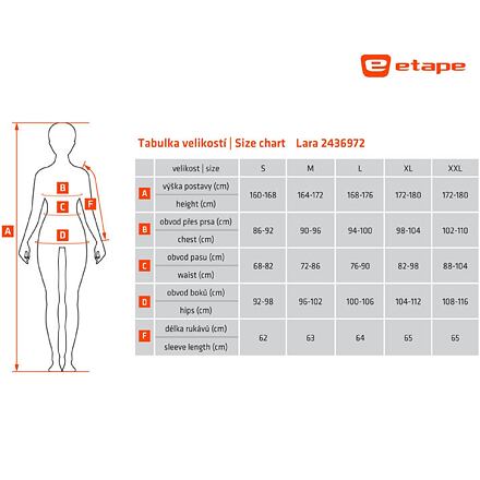 Mikina pre ženy ETAPE LARA je ideálna ako 2.vrstva na šport aj bežné nosenie, kedy sa vonkajšie teploty pohybujú v rozmedzí od 0 °C do 15 °C. Vďaka použitým technológiám Velvet Soft so zateplením a SuperDryntex vás bude príjemne hriať a zároveň bude funkčne odvádzať pot a vlhkosť od pokožky pri športových aktivitách. Mikina má klasický dlhý zips, 3 predné vrecká na zips a dlhšie zipsy pre ľahšiu manipuláciu. Velvet Soft – syntetický termoizolačný materiál, ktorý sa výborne hodí ako 2.vrstva. Materiál je veľmi príjemný na dotyk a poskytuje vysokú hrejivosť. Vďaka vysokému chlpu tvorí zároveň izolačnú vrstvu zo zachyteného vzduchu a zabraňuje tak nechcenému ochladzovaniu tela. SuperDryntex - funkčný elastický materiál z polyesterových mikrovlákien, ktorý veľmi rýchlo schne, odvádza pot a vlhkosť od pokožky. Pre svoju antibakteriálnu úpravu a odolnosť proti škvrnám sa veľmi ľahko udržuje. Odlišné gramáže tohto materiálu ponúkajú rôzne termoizolačné vlastnosti. - materiál: 100% polyester - prať na 30 ° C, nebieliť, nežehliť, nečistiť chemicky, nepoužívať aviváž Veľkostná tabuľka v obrázkoch. Uvedené hodnoty sú iba orientačné, vhodná veľkosť sa môže líšiť podľa konkrétnej postavy.