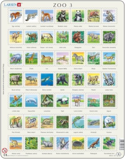 Určite poznáš zebru, krokodíla alebo paviána... Ale vieš, že medzi zvieratami žije aj kuskus alebo tasmánsky čert a psohlavec zelený nie je vôbec cicavec? Puzzle LARSEN, to je učenie, ktoré baví! Edukatívne rámové puzzle Zvieratá sveta ti ukáže 49 známych aj menej známych obyvateľov našej planéty. K jednotlivým názvom sa priraďuje dielik s obrázkom. Každý dielik má iný tvar a celé puzzle je možné zložiť, len keď sú všetky dieliky umiestnené správne. Puzzle je v češtine.