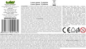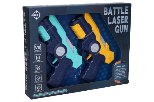 Laser game 2 pištole. Veľkosť 20 cm. Svetelné a zvukové efekty. 2xAA batérie do každej pištole nie sú súčasťou. Obrázkový návod s popisom na ovládanie na zadnej strane obalu. Aktivácia hry prepínačom v zadnej časti pištole, nabíjanie naťahovacím mechanizmom pod hlavnou.