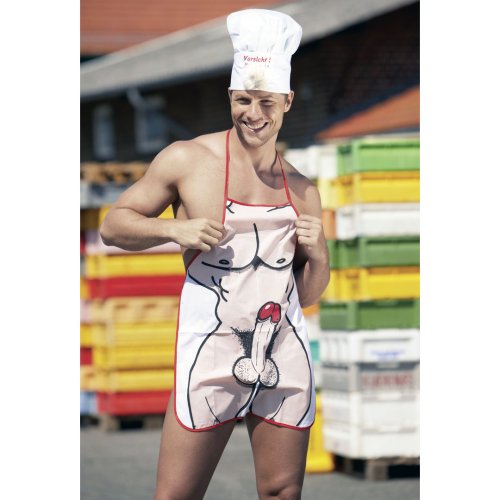 Zábavná látková zástera na varenie s kresleným obrázkom nahého mužského tela.