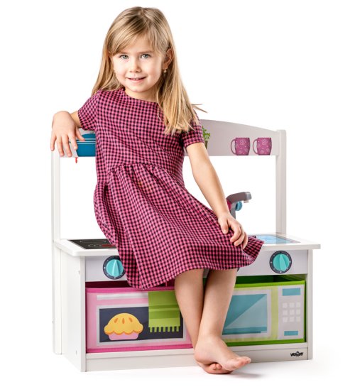 Lavica s úložným priestorom pre hračky je zároveň aj kuchynkou s otočnými gombíkmi a vodovodnou batériou, ktorá sa upevní na vrchnú dosku pomocou magnetu. Obsahuje: 3 dieliky. Rozmer: 59 x 31,5 x 58 cm. Výška pracovnej dosky: 28,5 cm. Vek: 3+