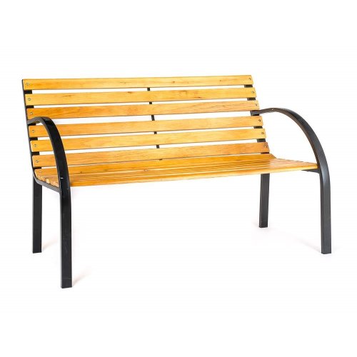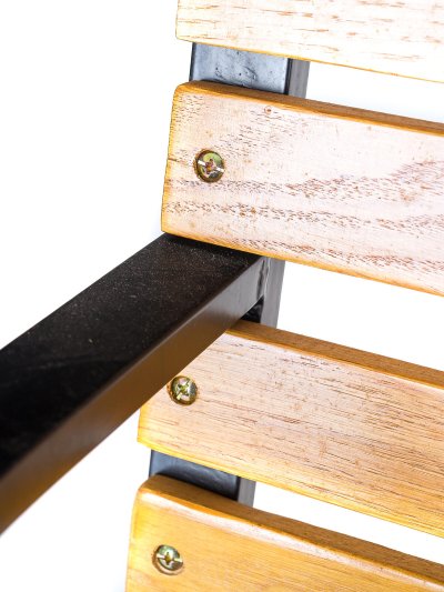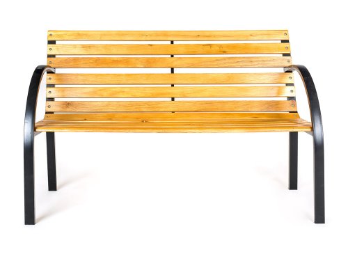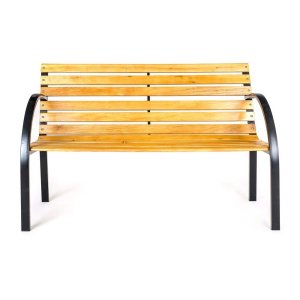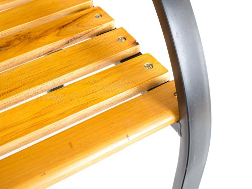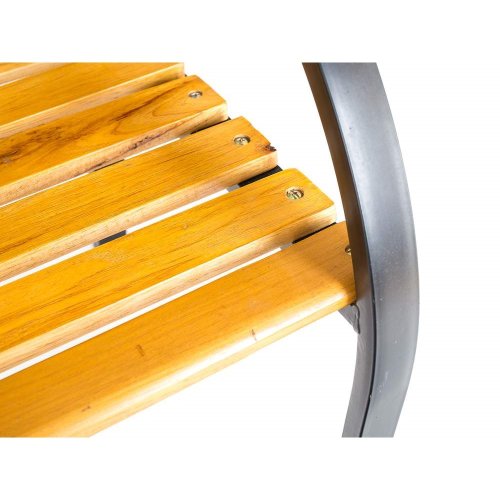 Záhradná lavička TANSSI je vyrobená z oceľovej konštrukcie (čiernej farby), drevené laty sú v prírodnej farbe.