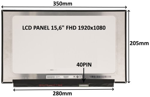 Uhlopriečka: 15,6" Rozlíšenie: 1920x1080 FHD Konektor: 40 PIN Typ podsvietenia: LED Povrch LCD panela: MATNÝ Technológia LCD panela: IPS Rozmery: Šírka: 350 mm Výška: 205 mm Dĺžka invertora: 280 mm Spôsob : - lepenie k LCD krytu Záruka: 24 mesiacov aj na chybné pixely