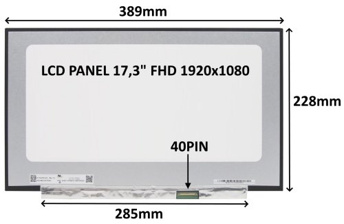 Uhlopriečka: 17,3" Rozlíšenie: 1920x1080 FHD Konektor: 40 PIN Typ podsvietenia: LED Povrch LCD panelu: MATNÝ Technológia LCD panelu: IPS Rozmery: Šírka: 389 mm Výška: 228 mm Dĺžka invertora: 285 mm Spôsob : - lepenie k LCD krytu Záruka: 24 mesiacov aj na chybné pixely