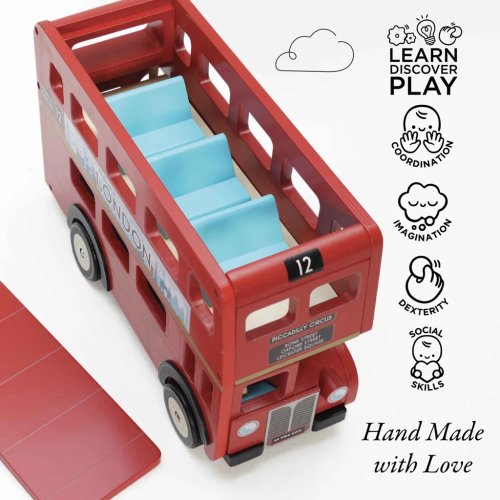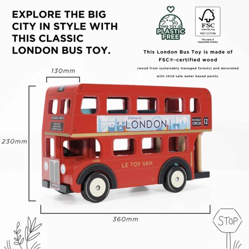 S autobusom London môžete toto hlavné mesto prejsť bezpečne a štýlovo. Ikonická hračka vyhrala niekoľko ocenení a je zrejme najobľúbenejšou hračkou z ponuky Le Toy Van. Sýto červený exteriér londýnskeho dvojposchodového autobusu má realistické značenie, deti si s ním určite užijú mnoho predstavivej zábavy. Samozrejme mu nechýbajú sedadlá, má odklápaciu strechu aj vrchné poschodie. Hračka pomôže s rozvojom predstavivosti, zručnosti a jemnej motoriky. Vyrobené z udržateľného dreva, maľované farbami na báze vody. Hračky s účelomVšetky hračky firmy Le Toy Van sú vyrobené s cieľom - aby dlho vydržali. Dizajnované s láskou skúsenými remeselníkmi za použitia etických praktík a udržateľných materiálov, ktoré sú láskavejšie k našej planéte. Hlavné vlastnosti: vyrobené eticky z udržateľného FSC dreva testované podľa najprísnejších štandardov maľované netoxickými farbami na báze vody inšpiruje k predstavivej hre rozvíja kognitívne zručnosti hračka bez obsahu plastu Ocenenie hračky: Le Toy Van, ktorá vyhrala mnoho ocenení. Presnejšie zatiaľ vyše 15 ocenení za predstavivé autá a stavebné hračky. Podporujú detskú fantáziu, sú ideálne na predstavivú hru, rozvíjajú kreativitu a hravo zlepšujú detskú koordináciu ruka-oko. Značka a certifikát FSC® (Forest Stewardship Council) zaručuje, že drevo, z ktorého bol produkt vyrobený, nebolo vyťažené nelegálne a pochádza z lesov obhospodarovaných šetrným či prírode blízkym spôsobom, v ktorom sú dodržiavané prísne environmentálne a sociálne požiadavky. Značka FSC® na výrobku znamená, že svojim nákupom pomáhate chrániť lesy a podporujete šetrné, zodpovedné či prírode blízke hospodárenie, vďaka ktorému sú naše lesy stabilnejšie, zdravšie, majú prirodzenú druhovú skladbu a lepšie odolávajú negatívnym následkom klimatických zmien.