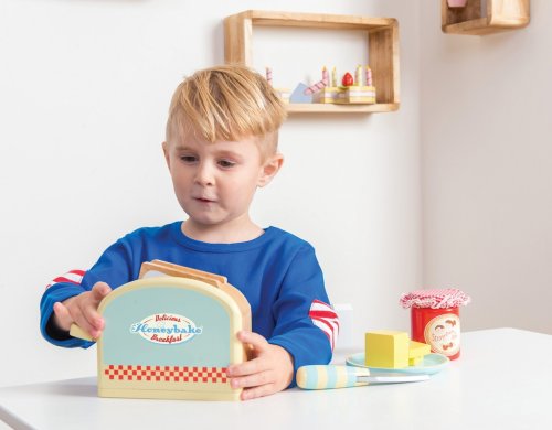 Dobré ráno, kto si dá na raňajky anglické toasty? Táto sada je perfektná pre predstavivú hru na role. V balení hriankovač s pružinami, z ktorého vyskočia 2 krajce toastového chleba, kúsky masla so suchým zipsom, pohár džemu, nôž a tanier. Hračka je vyrobená z odolného a udržateľného dreva, deťom podporí v rozvoji sociálnych zručností, zručnosti a jemnej motoriky. Hračky s účelomVšetky hračky firmy Le Toy Van sú vyrobené s cieľom - aby dlho vydržali. Dizajnované s láskou skúsenými remeselníkmi za použitia etických praktík a udržateľných materiálov, ktoré sú láskavejšie k našej planéte. Hlavné vlastnosti: vyrobené eticky z udržateľného dreva testované podľa najprísnejších štandardov maľované netoxickými farbami na báze vody inšpiruje k predstavivej hre rozvíja kognitívne zručnosti Honeybake kolekcie: Hračky v tejto kolekcii sú vhodné na objavovanie, pomôžu deťom s rozvojom predstavivosti, sociálnych a verbálnych zručností a kogni. Tradičný dizajn s modernými detailmi deti určite bude baviť. Honeybake je kolekcia Le Toy Van, ktorá vyhrala najviac ocenení, a to za dizajn, kvalitu, bezpečnosť a tiež za vzdelávaciu a hernú hodnotu.