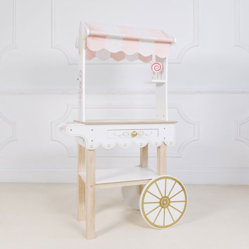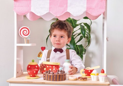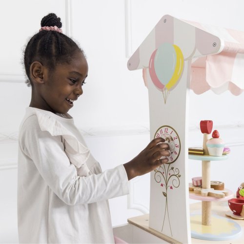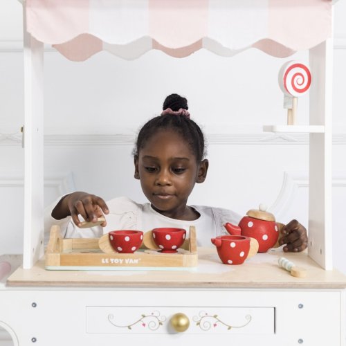 Je čas na čaj! Tento čajový vozík zaujme na prvý pohľad. Má krásny vintage design, farebný baldachýn a zlatisté detaily. Vozík má tajný šuplík, do ktorého si deti môžu uložiť peniaze za predaj dobrôt. Nechýbajú dve kolieska a madlo na jednoduché presúvanie vozíka, tiež farebné ilustrácie a ponuková tabuľka na kriedu. Sú použité netoxické farby na báze vody. Vyrobené z prírodného kaučukového dreva . Hračky s účelomVšetky hračky firmy Le Toy Van sú vyrobené s cieľom - aby dlho vydržali. Dizajnované s láskou skúsenými remeselníkmi za použitia etických praktík a udržateľných materiálov, ktoré sú láskavejšie k našej planéte. Hlavné vlastnosti: vyrobené eticky z udržateľného drevatestované podľa najprísnejších štandardovmaľované netoxickými farbami na báze vodyinšpiruje k predstavivej hrevhodnej pre hru na rolehračka vyhrala ocenenie Ocenenie hračky:Good Toy Guide Recommended Honeybake kolekcia: sociálnych a verbálnych zručností a kognitívnych funkcií. Tradičný dizajn s modernými detailmi deti určite bude baviť. Honeybake je kolekcia Le Toy Van, ktorá vyhrala najviac ocenení, a to za dizajn, kvalitu, bezpečnosť a tiež za vzdelávaciu a hernú hodnotu.